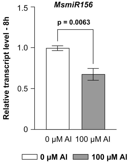 Effect of Al stress on the expression of MsmiR156 in WT alfalfa roots. Each bar represents the mean of the relative MsmiR156 transcript level. Error bars represent the standard error of the mean (SEM). A Student’s t-test in R (version R-4.2.3) was conducted with n = 4 individual plants. p ≤ 0.05 indicates a significant difference between the two groups.