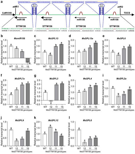 To evaluate the efficiency of miR156 silencing in alfalfa, we utilized STTM technology [] to generate miR156 knockdown alfalfa plants (MsSTTM156). This was achieved by doubling the number of tandem repeats and tripling the 48 nt spacer, creating a longer construct expected to enhance the suppression efficacy of miR156 (Figure 2a,b). Using RT-qPCR analysis, we assessed the transcript levels of miR156 and its putative target SPL genes in four independent MsSTTM156 alfalfa plants compared to WT (Figure 2b–l). The expression of mature MsmiR156 was reduced by 136% in genotype MsSTTM156-15, 45% in MsSTTM156-11, and 20% in MsSTTM156-12 relative to WT (Figure 2b). As miR156 was shown to downregulate at least 11 SPL genes in alfalfa [], MsmiR156 silencing influenced the expression of some of these genes in MsSTTM156 plants. Notably, six MsSPL genes, namely MsSPL13, MsSPL13a, MsSPL6, MsSPL7a, MsSPL3, and MsSPL4 showed increased transcript levels in one-month-old leaves of MsSTTM156 plants (Figure 2c–h). However, there was some variability between MsmiR156 downregulation and MsSPL expression in MsSTTM156 genotypes. For instance, while both MsSPL2a and MsSPL9 increased in MsSTTM156-15, they decreased in MsSTTM156-11 and MsSTTM156-12 (Figure 2i,j). Conversely, MsSPL12 showed an increase in MsSTTM156-12 and MsSTTM156-11 but a decrease in MsSTTM156-15 (Figure 2k). Similarly, MsSPL3 showed increased expression in MsSTTM156-11 and MsSTTM156-15, yet decreased in MsSTTM156-12 (Figure 2g). Despite the substantial decrease in miR156 levels, the relative transcript level of MsSPL8 was reduced in all MsSTTM156 genotypes (Figure 2l). This variability suggests the possibility of alternative miR156 regulatory pathways or feedback mechanisms similar to the SPL15-miR156 regulatory loop identified in Arabidopsis [].