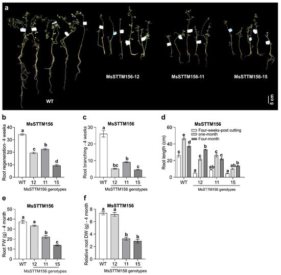 Phenotypic characterization of MsSTTM156 alfalfa plants(miRNA156 silencing/knock down). (a) Visual comparison of one-month-old stem cuttings between WT and MsSTTM156 plants (miRNA156 silencing/knock down: MsSTTM156-12, MsSTTM156-11, and MsSTTM156-15), (b) root regeneration capacity of one-month-old stem cuttings, (c) root branching patterns in one-month-old stem cuttings, (d) root length at different developmental stages: one-month-old stem cuttings, one-month post-propagation, and four-month post-propagation, (e) fresh weight of roots from four-month-old plants, (f) dry weigh of roots from four-month-old plants. Each bar represents the mean. Error bars represent SEM. One-way ANOVA was conducted with n = 4 individual plants. Significant differences detected from the one-way ANOVA in R (version R-4.2.3) were followed by a post hoc Tukey multiple comparison test. Means with the same letters are not significantly difference at a p ≤ 0.05.