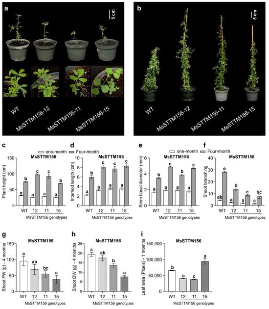 Phenotypic characterization of MsSTTM156 alfalfa plants (miRNA156 silencing/knock down). (a) Phenotypic appearance of one-month-old plants, (b) phenotypic appearance of four-month-old plants including flowering of MsSTTM156-11 and MsSTTM156-12 at one- and 4-month-old; (c) plant height; (d) internode length; (e) basal stem diameter, and (f) shoot branching; as well as (g) shoot fresh weight at four months; (h) shoot dry weight at four months, and (i) leaf area at one-month. Each Error bar represents SEM. One-way ANOVA was conducted with n = 4 individual plants. Significant differences detected from the one-way ANOVA in R (version R-4.2.3) were followed by a post hoc Tukey multiple comparison test. Means with the same letters are not significantly different at a p ≤ 0.05.