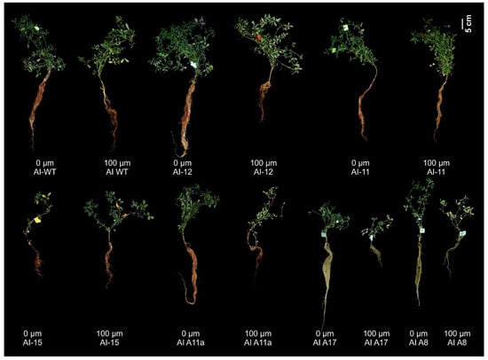 Effects of MsmiR156 silencing and overexpression on the phenotypic appearance of 63-day-old alfalfa plants under Al stress. MsSTTM156 genotypes (miRNA156 silencing/knock down: 12, 11, and 15), MsmiR156OE genotypes (A11a, A17, and A8), and WT plants. Each genotype was either left untreated (control, 0 µM Al) or exposed to Al treatment (100 µM Al). The control group is denoted as 0 µM Al-WT, 0 µM Al-12, 0 µM Al-11, 0 µM Al-15, 0 µM Al-A11a, 0 µM Al-A17, and 0 µM Al-18. The Al-treated group, subjected to 100 µM Al, includes 100 µM Al-WT, 100 µM Al-12, 100 µM Al-11, 100 µM Al-15, 100 µM Al-A11a, 100 µM Al-A17, and 100 µM Al-18. Phenotypic changes, recorded 14 days after Al treatment, included root shortening and browning caused by increased acidity under Al stress. Scale bar = 5 cm.