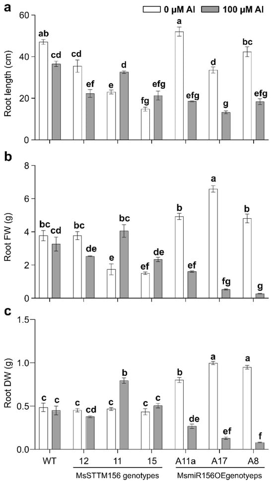 Effects of MsmiR156 silencing and overexpression on alfalfa’s phenotypic response to 14 days of Al stress. (a) root length of MsSTTM156, MsmiR156OE, and WT exposed; (b) root fresh weight, (c) root dry weight; Each bar indicates a biological mean. Error bars represent SEM. A two-way ANOVA was conducted across all treatments and genotypes, with n = 4 individual plants. Significant results detected from the two-way ANOVA in R (version R-4.2.3) were followed by a post hoc Tukey multiple comparison test. Means with the same letters are not significantly different at a p ≤ 0.05.