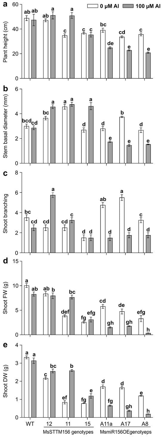 Effects of MsmiR156 silencing and overexpression on alfalfa’s phenotypic response to Al stress. (a) plant height of MsSTTM156 (11, 12, 15), MsmiR156OE (A11a, A17, A8), and WT plants exposed to Al stress for 14 days, (b) basal stem diameter, (c) shoot branching, (d) shoot fresh weight, (e) shoot dry weight. Each bar indicates the mean. Error bars represent SEM. A two-way ANOVA was conducted across all treatments and genotypes, with n = 4 individual plants. Significant differences detected from the two-way ANOVA in R (version R-4.2.3) were followed by a post hoc Tukey multiple comparison test. Means with the same letters are not significantly different at p ≤ 0.05.