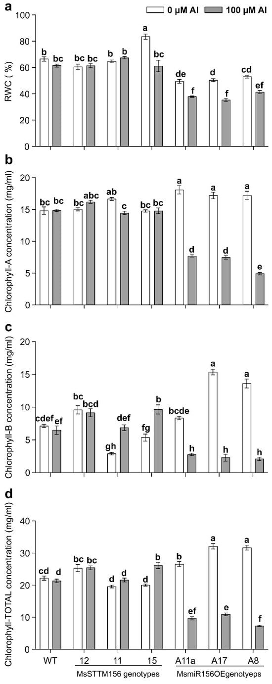 Effects of MsmiR156 silencing (MsSTTM156) and overexpression (MsmiR156OE) on alfalfa’s physiological response to Al stress. (a) leaf water content, (b) chlorophyll-A, (c) chlorophyll-B, (d) chlorophyll-TOTAL; Each bar plot indicates the mean. Error bars represent SEM. A two-way ANOVA was conducted across all treatments and genotypes, with n = 4 individual plants. Significant differences detected from the two-way ANOVA in R (version R-4.2.3) were followed by a post hoc Tukey multiple comparison test. Means with the same letters are not significantly different at a p-value ≤ 0.05.