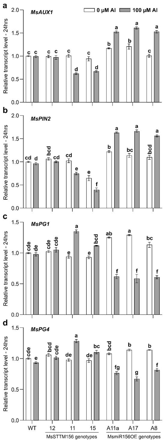 Expression patterns of MsAUX1, MsPIN2, MsPG1, and MsPG4 in the root tips of MsSTTM156, MsmiR156OE, and WT plants exposed to 100 µM Al for 24 h. (a) MsAUX1, (b) MsPIN2, (c) MsPG1, (d) MsPG4. Each bar plot indicates the mean. Error bars represent SEM. A two-way ANOVA was conducted across all treatments and genotypes, with n = 4 individual plants. Significant differences detected from the two-way ANOVA in R (version R-4.2.3) were followed by a post hoc Tukey multiple comparison test. Means with the same letters are not significantly different at a p-value ≤ 0.05.