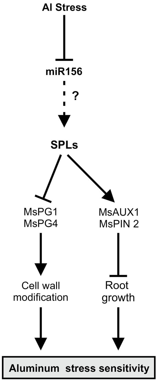 MsmiR156OE disrupts root development, reduces plant height and biomass, and limits water uptake, as evidenced by decreased relative water content (RWC). This disruption extends to chlorophyll synthesis, impairing photosynthesis and overall plant growth. At the molecular level, MsmiR156OE upregulates auxin transport genes, MsAUX1 and MsPIN2, causing imbalances in IAA distribution that inhibit root elongation, which is in agreement with previous findings []. Simultaneously, the downregulation of cell wall-related genes, MsPG1 and MsPG4, increases pectin content and reduces cell wall flexibility, exacerbating Al accumulation and intensifying root damage, as supported by earlier studies [,]. These findings are presented in a proposed model (Figure 10) that illustrates miR156 as a master negative regulator of Al response in alfalfa. The model highlights miR156’s central role in regulating phenotypic, physiological, and molecular responses either directly or indirectly through unknown SPL genes and their downstream targets. Under Al stress, miR156 modulates the expression of critical genes, including MsAUX1, MsPIN2, MsPG1, and MsPG4, leading to root inhibitions and heightened Al susceptibility. Taken together, our results suggest that miR156 is a key negative regulator of Al tolerance in alfalfa.