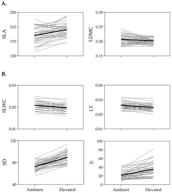 Reaction norm plots for the 40 Iris genotypes (fine lines) observed under two temperature treatments—ambient and elevated. The mean phenotypic plasticity is indicated by a heavy line. (A) Functional leaf traits: specific leaf area (SLA, in cm2 g−1), leaf dry matter content (LDMC, in g g−1). (B) Mechanistic leaf traits: specific leaf water content (SLWC, g cm−2), leaf thickness (LT), stomatal density (SD, no. stomata/mm2), and RGB index I1.