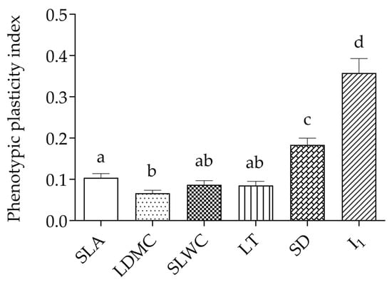 The phenotypic plasticity indices (mean ± SE) for the functional (SLA, LDMC) and mechanistic (SLWC, LT, SD, RGB index I1) leaf traits of 40 distinct I. pumila genotypes expressed at ambient and elevated air temperatures. Means with the same letter are not significantly different at p > 0.05, according to the Wilcoxon rank-sum test.