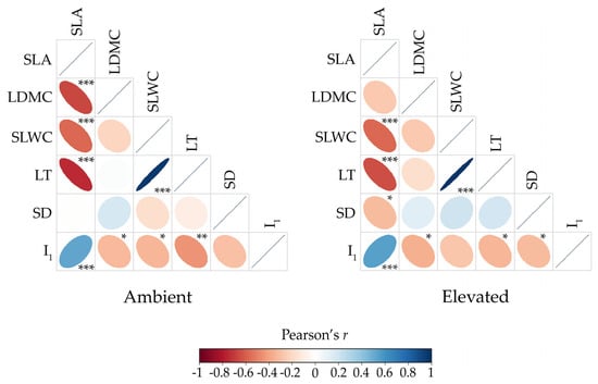 Heat maps of the correlations between the functional (SLA and LDMC) and mechanistic (SLWC, LT, SD, RGB index I1) leaf traits under ambient and elevated temperature conditions. The color gradient and ellipse eccentricity represent the strength and direction of the correlations, with blue indicating stronger positive correlations and red indicating stronger negative correlations. Correlation values are identified as weak (r < 0.4), moderate (0.4 ≤ r ≤ 0.8), or strong (r > 0.8). Asterisks indicate the significance level of the correlations: * p < 0.05, ** p < 0.01, *** p < 0.001.