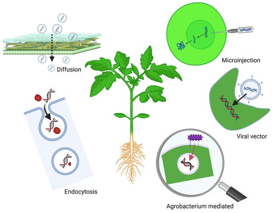 Different nucleic acid delivery methods in plants for RNA interference. Various approaches are used to deliver molecules into cells. Diffusion: small molecules pass through cell layers. Endocytosis: molecules pass through cellular vehicles into the target site. Microinjection: molecules are directly injected into the cellular cytoplasm. Viral vectors: these utilize plant viruses to deliver genetic molecules into plant cells. Agrobacterium-mediated: Agrobacterium tumefaciens ensure the gene transfer inside plant cells. Figure created with Biorender “https://app.biorender.com/user/signin (accessed on 18 February 2024)”.