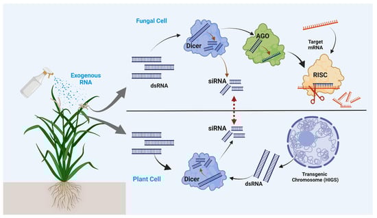 Step-by-step exogenous dsRNA or sRNA-mediated gene silencing for crop protection against pathogens. The arrow sign between fungal and plant cells shows the cross-kingdom transfer of potential siRNA molecules produced from transgenic plants. Exogenously applied dsRNA material is primarily processed by hosts Dicer and AGO proteins, which are finally incorporated into RISC complex for gene silencing. Figure created with Biorender “https://app.biorender.com/user/signin (accessed on 19 January 2024)”.