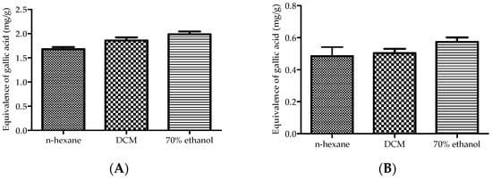 The total phenolic and flavonoid contents of the plant extracts are presented in Figure 1. All the extracts exhibited the presence of both phenolic (A) and flavonoid (B) contents. Notably, the 70% ethanol extract demonstrated the highest phenolic content (1.99 ± 0.10 mg/g) and flavonoid content (0.57 ± 0.05 mg/g), significantly surpassing those of the n-hexane extract (1.68 ± 0.07 mg/g and 0.49 ± 0.01 mg/g, respectively) and dichloromethane (DCM) extract (1.86 ± 0.11 mg/g and 0.50 ± 0.05 mg/g, respectively).