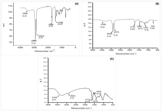 Represents FTIR spectra of B. bowkeri extracts obtained with n-hexane (A), dichloromethane (DCM) (B), and 70% ethanol (C), showing the presence of functional groups (n = 3).
