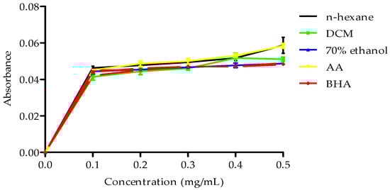 However, all the extracts showed poor metal iron chelating activity. Conversely, the extracts demonstrated reduction potential, with the n-hexane extract exhibiting higher reduction potential than the butylated hydroxyanisole (BHA) standard, as illustrated in Figure 3.