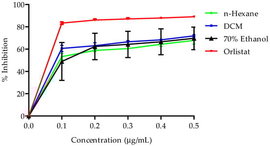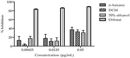 The inhibitory effects of the three extracts on pancreatic lipase activity were evaluated at various concentrations, and the results are illustrated in Figure 5. The extracts exhibited a dose-dependent inhibition of pancreatic lipase activity, with the following order of potency: DCM extract > n-hexane extract > 70% ethanol extract.
