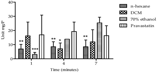 The effects of the extracts on HMG-CoA reductase activity are presented in Figure 6. All the extracts exhibited a time-dependent inhibitory effect on enzyme activity over a period of 7 min. Notably, the n-hexane extract demonstrated a significant and sustained inhibitory effect on HMG-CoA reductase activity between 4 and 7 min, with enzyme activity ranging from 8.51 ± 3.51 to 8.48 ± 4.76 Units/mgP. This inhibitory effect surpassed that of the standard pravastatin (19.26 ± 6.63 to 16.36 ± 7.01 Units/mgP).