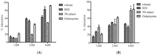 Notably, the extracts exhibited an increase in adsorption as the concentration increased against cholic and deoxycholic acid, comparable to the positive control cholestyramine.