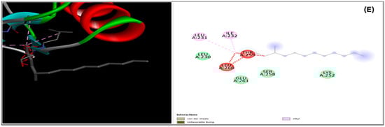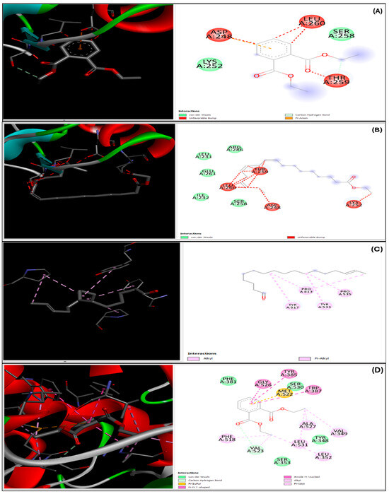 The docking scores presented in Table 3 represent the binding affinities of primary compounds to target proteins accompanied by enzyme interaction binding between specific amino acids and complexes as shown in Figure 8, as well as standards, expressed in kilocalories per mole (kcal/mol). Interestingly, Diethyl Phthalate (DEP) demonstrated significant binding affinity to hormone-sensitive lipase (HSL) and cyclooxygenase (COX), with docking scores of −5.9 kcal/mol and −5.5 kcal/mol, respectively. These scores indicate a high binding affinity of DEP to HSL and COX. Moreover, the comparable docking scores of DEP and simvastatin indicate similar binding affinities of both compounds to the target proteins. Furthermore, the docking score of −7.0 kcal/mol for COX indicates the highest binding affinity of DEP among the evaluated proteins.