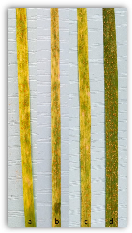 Seedling infection type responses to Puccinia striiformis race MEX14.191: (a) resistant parent (Kasuku, IT 23C), (b,c) homozygous resistant RILs (IT 23C), and (d) susceptible parent (Apav#1, IT 4).