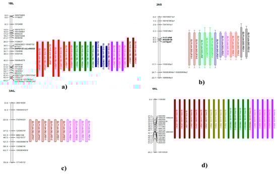 Another co-located QTL for triple rust resistance, QLrYrSr.cim-6AL, was identified on chromosome 6AL. This QTL exhibited consistency across different environments and years in both Mexico and Kenya. In Mexico, 7.3–11.7% and 7.5–9.5% of PVE for LR and YR resistance, respectively, was observed. In Kenya, it contributed 4–6% of PVE for YR resistance and accounted for 5–7.7% of PVE for SR resistance across all datasets. It spanned approximately 609–614 Mb on the IWGSC_RefSeq_v1.0 assembly [33] and was mapped between 1109580 and 3534344 DArTSeq markers (Table 3; Figure 3d; Supplementary Material—Table S1).