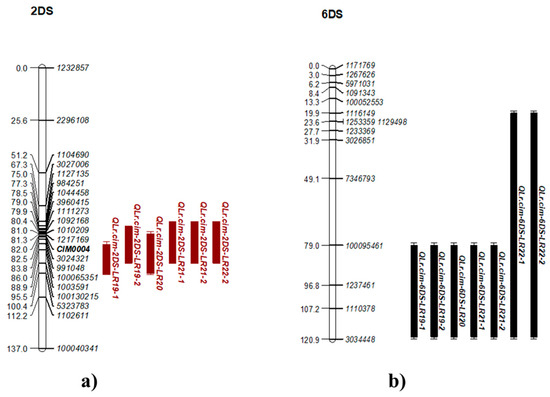Linkage maps showing QTL regions for minor leaf rust resistance: (a) QLr.cim-2DS (2DS) and (b) QLr.cim-6DS (6DS). The figures display chromosome segments with QTL and flanking markers based on genetic distances (cM). LOD values and physical positions are in Supplementary Material—Table S1.