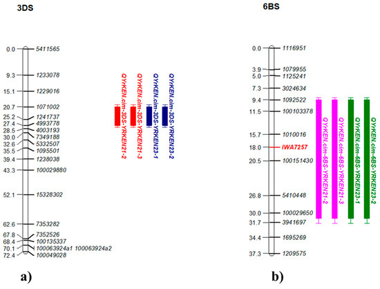 Linkage maps for minor QTL associated with stripe rust resistance in Kenya: (a) QYr.cim-3DS on chromosome 3DS and (b) QYr.cim-6BS on chromosome 6BS. The figures display chromosome segments with QTL and flanking markers based on genetic distances (cM). LOD values and physical positions are in Supplementary Material—Table S1.