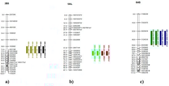 Linkage maps for minor QTL associated with stem rust resistance in Kenya: (a) QSr.cim-2BS on chromosome 2BS, (b) QSr.cim-5AL on chromosome 5AL, and (c) QSr.cim-6AS on chromosome 6AS. The figures display chromosome segments with QTL and flanking markers based on genetic distances (cM). LOD values and physical positions are in Supplementary Material—Table S1.