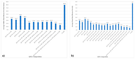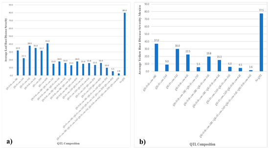 Mean disease severity (MDS) among RILs with various QTL combinations: (a) leaf rust in Mexico and (b) stripe rust in Mexico.