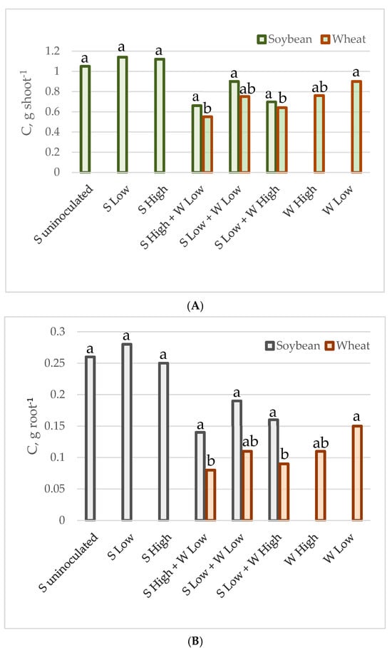 The mean carbon and nitrogen content in the shoots and roots of individual plants of soybean and spring wheat, grown as monocultures or intercrops at various plant densities, is presented in Table 3 and Figure 1 and Figure 2. In general, the carbon and nitrogen content was higher in soybeans than in wheat. The intercropping reduced nitrogen content in both the root and the shoot of soybean. The nitrogen content was reduced by 39% in the soybean’s shoot (from 0.074–0.082 g to 0.041–0.060 g on average), while in the roots the reduction reached 58% (from 0.020–0.025 g to 0.009–0.011 g on average). The intercropping did not significantly alter the carbon content in the shoots and roots; however, it was slightly lower in the mixtures (from 1.05–1.12 g to 0.70–0.90 g, and from 0.25–0.28 g to 0.14–0.19 g on average). Wheat was more affected by the density of the plants in the pot than by the presence of soybean, as the shoots and roots had a higher concentration of both elements in the crops from the experiment with low density in monocultures (0.050 g and 0.0077 g of nitrogen, as well as 0.9 g and 0.15 g of carbon in shoots and roots, respectively). The C and N content in wheat from the other cases was not statistically significantly different. The nitrogen content ranged from 0.032–0.042 g in the shoots and from 0.0038–0.0051 g in the roots, while the range of carbon values was 0.55–0.76 g in the shoots and 0.08–0.11 g in the roots on average.