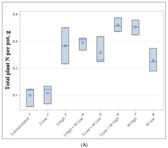 The soybean “Merlin” and spring wheat “Tanium” varieties were sown in pots as monocultures and intercrops with three replications. Each pot contained 4 or 8 plants of wheat, either 1 or 3 soybean plants, or a mixture of both. Treatments were as follows. Monocultures: (1) soybean, not inoculated—control, (2) soybean, low density (1 plant), (3) soybean, high density (3 plants), (4) wheat, low density (4 plants), (5) wheat, high density (8 plants); Mixtures: (6) soybean high density + wheat low density (3 + 4 plants, respectively), (7) soybean low density+ wheat low density (1 + 4 plants, respectively), (8) soybean low density + wheat high density (1 + 8 plants, respectively). Seeds of soybean were inoculated with peat inoculant containing Bradyrhizobium japonicum strain AGF78 with 1.5 × 109 colony forming units (CFU) g−1.
