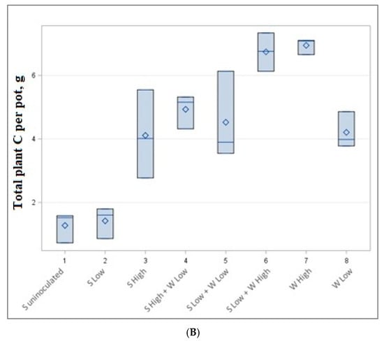 Total nitrogen (A) and carbon (B) content per pot in g.
