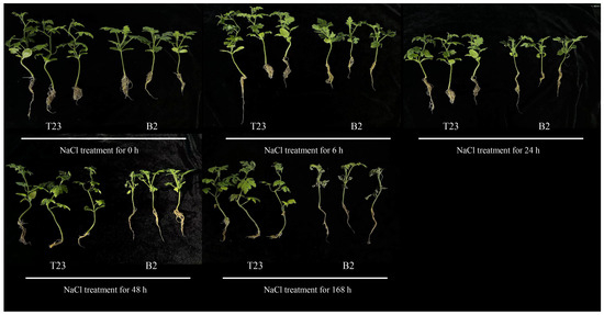 Two watermelon varieties, the salt-tolerant T23 and the salt-sensitive B2, were treated with a 200 mM NaCl solution (Figure 1). At 6 h of salt treatment, the B2 seedlings exhibited significant signs of stress: their cotyledons dehydrated and curled, true leaves wilted, and roots turned yellow. In contrast, the T23 plants showed no notable changes. At 24 h of salt treatment, the symptoms in the B2 seedlings worsened, with increased dehydration of the cotyledons, further wilting of the true leaves, and more pronounced root yellowing. The T23 plants began to show slight yellowing in their root systems. At 48 h of salt treatment, the B2 seedlings displayed intensified dehydration and yellowing in both cotyledons and lower true leaves, while the T23 plants exhibited yellowing in their cotyledons and a more pronounced yellowing in their root systems. At 168 h of salt treatment, the B2 plants’ root systems turned black, and some plants died. Meanwhile, the T23 plants showed dried-up cotyledons and yellowing in the leaves and roots, but no mortality was observed. Throughout the salt treatment period, the B2 variety consistently suffered more severe damage compared to the T23 variety.