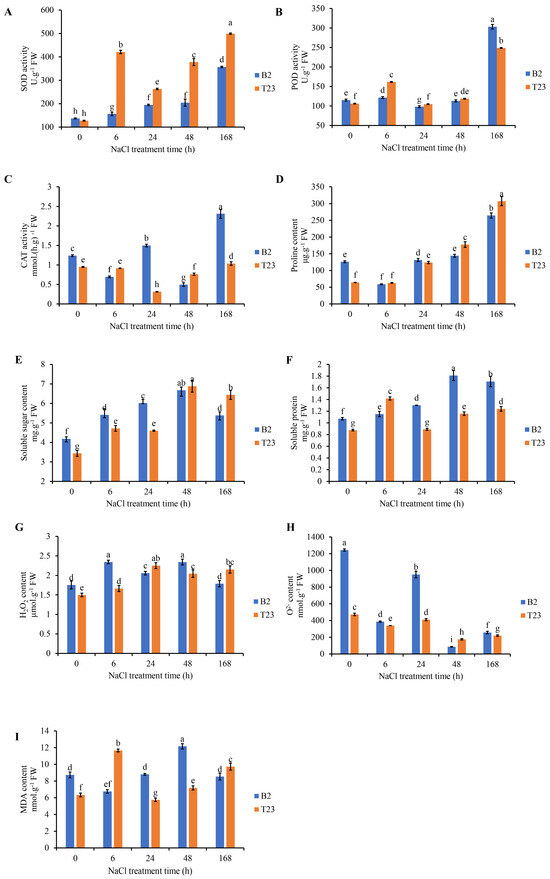 The proline content of the two varieties decreased after 6 h of salt treatment, then increased, and reached its peak at 168 h of salt treatment. At 24, 48, and 168 h of salt treatment, the proline content of T23 was significantly higher, by 93.74%, 177.55%, and 380.56%, than that at 0 h of salt treatment, respectively. Meanwhile, the proline content of B2 was significantly increased by 110.00% at 168 h of salt treatment, respectively (Figure 2D). The soluble sugar content was significantly increased under salt exposure in B2 and T23. At 6, 24, 48, and 168 h of salt treatment, the soluble sugar content of T23 was significantly increased by 38.73%, 35.31%, 102.35%, and 89.36% compared to that at 0 h of salt treatment, respectively. Meanwhile, the H2O2 content of B2 was significantly increased by 28.80%, 43.34%, 58.91%, and 28.20% at 6, 24, 48, and 168 h of salt treatment, respectively (Figure 2E). The soluble protein content of both varieties significantly increased after the salt treatment. At 6, 24, 48, and 168 h of salt treatment, the soluble sugar content of T23 was significantly increased by 61.07%, 1.25%, 31.56%, and 40.90% compared to that at 0 h of salt treatment, respectively. Meanwhile, the H2O2 content of B2 was significantly increased by 7.64%, 21.61%, 69.19%, and 59.61% at 6, 24, 48, and 168 h of salt treatment, respectively (Figure 2F). The H2O2 content of both varieties significantly increased after salt treatment. At 6, 24, 48, and 168 h of salt treatment, the H2O2 content of T23 was significantly increased by 10.93%, 50.05%, 36.39%, and 43.48% compared to that at 0 h of salt treatment, respectively. Meanwhile, the H2O2 content of B2 was significantly increased by 33.18%, 16.93%, 33.10%, and 1.53% at 6, 24, 48, and 168 h of salt treatment, respectively (Figure 2G). After salt treatment, the O2− content of both varieties significantly decreased. At 0, 6, 24, and 168 h of salt treatment, the O2− content in T23 was significantly decreased by 61.92%, 12.20%, 56.80%, and 14.20% compared to that in B2 (Figure 2H). The MDA content of B2 and T23 first decreased and then increased, while that of T23 first increased and then decreased (Figure 2I).