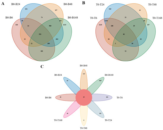 Venn diagrams of DEGs in B2 and T23. (A) B0–B6, B0–B24, B0–B48, and B0–B168 comparisons for B2; (B) T0–T6, T0–T24, T0–T48, and T0–T168 comparisons for T23; and (C) three different compared groups for B2 and T23.
