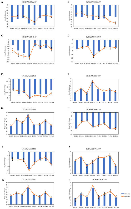Comparison analysis of qRT-PCR and RNA-seq for 12 genes. (A) ClCG00G005370, (B) ClCG01G000580, (C) ClCG01G004940, (D) ClCG01G019850, (E) ClCG02G001870, (F) ClCG02G008490, (G) ClCG02G023880, (H) ClCG03G000150, (I) ClCG03G001690, (J) ClCG04G011880, (K) ClCG05G024110, (L) ClCG01G010280. The gene expression level of RNA-seq is shown as Log2(fold change) and the fold-change is based on FPKM values of the drought stress group relative to the control group. The gene expression level of qRT-PCR is shown as Log2 (fold change = 2−ΔΔCt).