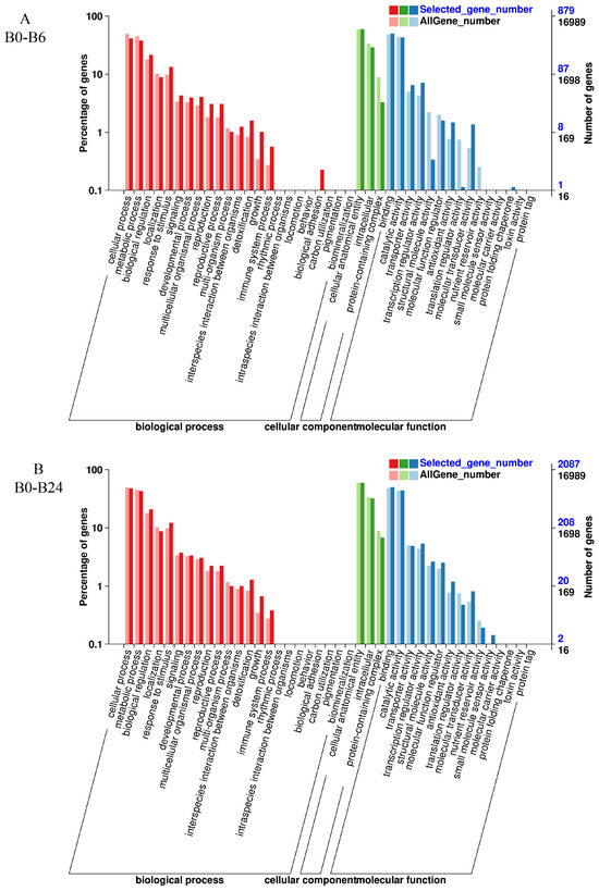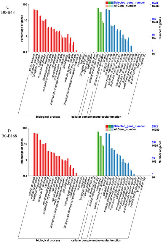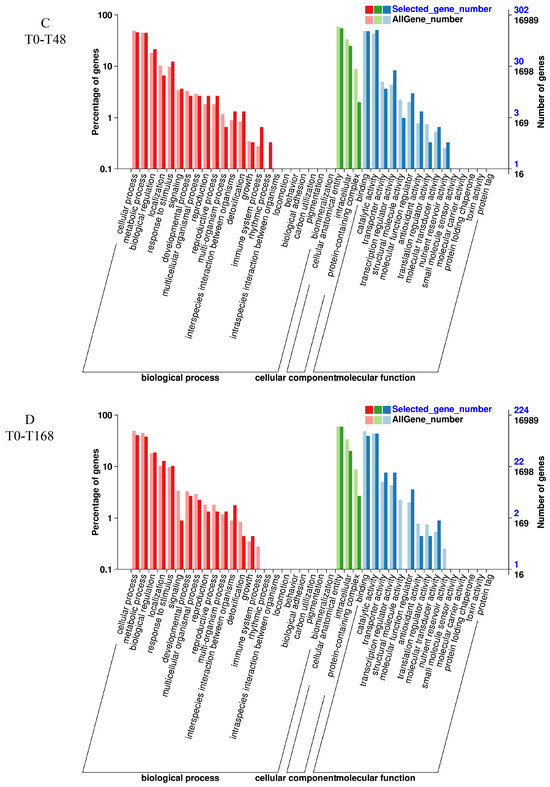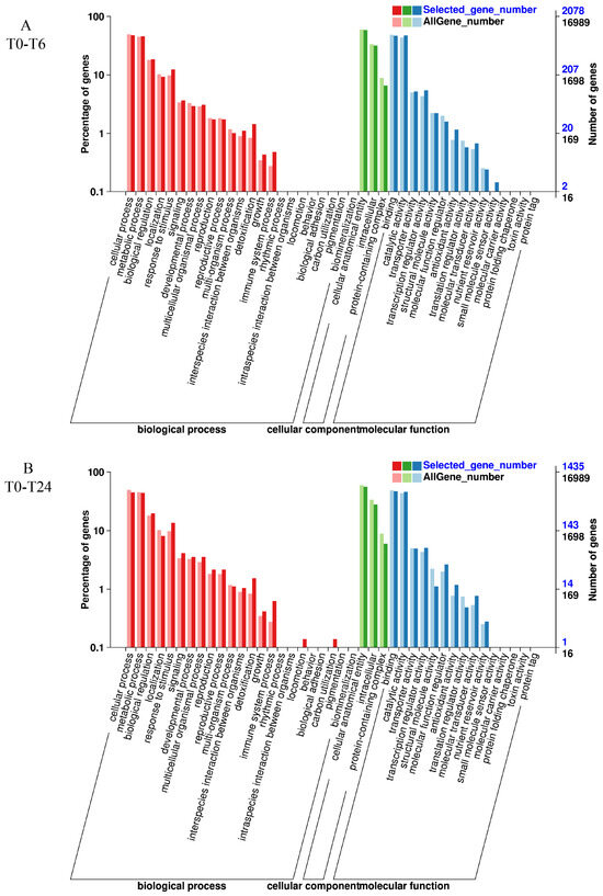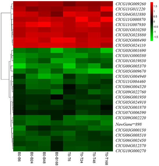 Before downstream analyses, we filtered low-quality or adaptor-polluted reads and those with a high content of unknown base (N) reads using internal software. Clean data (clean reads) were obtained by removing low-quality reads and reads containing adapter and poly-N from the raw data and Q20, Q30, GC-content and sequence duplication level of the clean data were calculated. After filtering, the remaining reads were stored in a FASTQ format for downstream analysis. Clean reads from every sample were mapped to the reference Watermelon Charleston Gray genome v2.5 (http://cucurbitgenomics.org). Raw counts of genes were determined using feature counts [42]. Differentially expressed genes (DEGs) between two samples DESeq2 (EBSeq) with |log2fold change| ≥ 1 and a false discovery rate (FDR) < 0.05 were considered significant expression differences [43]. DEG functions were annotated using the Kyoto Encyclopedia of Genes and Genomes (KEGG) and Gene Ontology (GO) databases [44]. The comparisons B0 vs. B6, B0 vs. B24, B0 vs. B48, and B0 vs. B168 in the transcriptome comparison analysis of B2 are referenced as B0–B6, B0–B24, B0–B48, and B0–B168, respectively. Similarly, comparisons of T0 vs. T6, T0 vs. T24, T0 vs. T48, and T0 vs. T168 are referenced as T0–T6, T0–T24, T0–T48, and T0–T168, respectively.