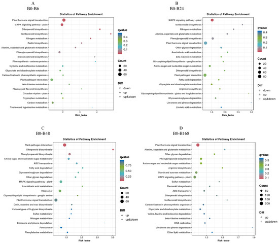 To clarify the metabolic pathways of watermelon in response to salt stress, we conducted a KEGG enrichment analysis. For B2, plant hormone signal transduction, MAPK signaling pathway—plant and diterpenoid biosynthesis; MAPK signaling pathway—plant, isoflavonoid biosynthesis, and nitrogen metabolism; plant–pathogen interaction, diterpenoid biosynthesis, and phenylpropanoid biosynthesis; and plant hormone signal transduction, alanine, aspartate, and glutamate metabolism, and other glycan degradation were enriched at 6, 24, 48, and 168 h of salt treatment, respectively. And hormone signal transduction, diterpenoid biosynthesis, plant–pathogen interaction, and MAPK signaling pathway—plant were enriched in four groups together (Figure 7).