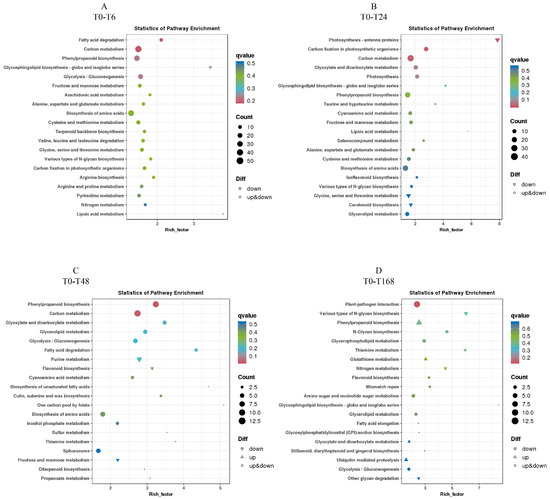 For T23, fatty acid degradation, carbon metabolism, and phenylpropanoid biosynthesis; photosynthesis antenna proteins, carbon fixation in photosynthetic organisms, and carbon metabolism; phenylpropanoid biosynthesis, carbon metabolism, and glyoxylate and dicarboxylate metabolism; and plant–pathogen interaction, various types of n-glycan biosynthesis, and phenylpropanoid biosynthesis were enriched at 6, 24, 48, and 168 h of salt treatment, respectively. And thiamine metabolism and carbon metabolism were enriched together (Figure 8).