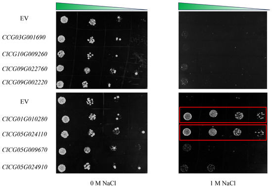 These genes are ClCG03G001690 (uncharacterized protein LOC101209654), ClCG10G009260 (mitochondrial AOX2), ClCG09G022760 (glyceraldehyde-3-phosphate dehydrogenase, GAPCP2), ClCG09G002220 (beta-hordothionin-like), ClCG01G010280 (tonoplast dicarboxylate transporter), ClCG05G024110 (NAC domain-containing protein 1), ClCG05G009670 (nigrin b), and ClCG05G024910 (pyruvate dehydrogenase E1 component subunit alpha, mitochondrial), respectively. We generated an overexpression model of yeast using the pRS416 vector. The yeast cells with salt tolerance candidate gene overexpression were exposed to 1 M NaCl. Under NaCl stress, ClCG01G010280 and ClCG05G024110 were highly tolerant when compared to EV (Figure 10). These results indicate that the ClCG01G010280 and ClCG05G024110 genes play an important role in response to salt stresses.