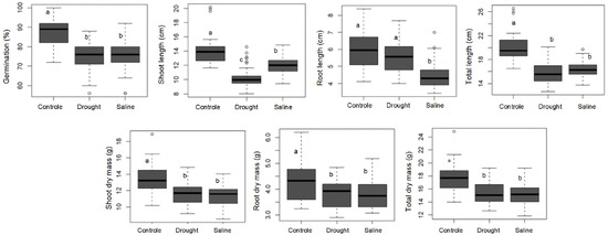 Figure 1. Effects of non-stressful (control) and stressful (drought and salinity) growth environments on the germination, shoot length, root length, total plant length, shoot dry mass, root dry mass and total dry mass of 11 tropical wheat cultivars (Triticum aestivum L). The total number of samples (n) for each environment was 44. Bars followed by different letters show significant differences using the Tukey test (α = 0.05).
