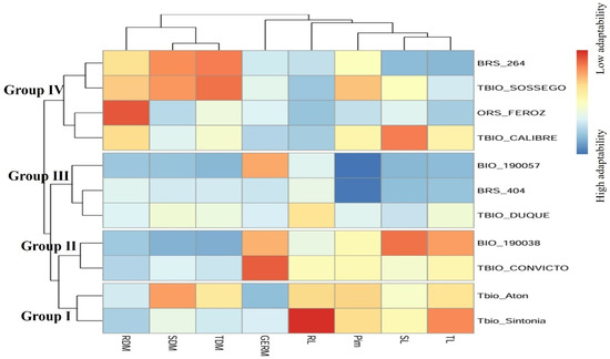Another way to select the cultivars is through a cluster analysis using the means obtained in Table 3, and with them, a hierarchical grouping UPGMA (unweighted pair group method with arithmetic mean) was performed (Figure 2). The figure shows the formation of four different groups when considering the values obtained from the univariate Pi for the seven morphological traits evaluated and the multivariate Pim. The groups within Group III are those that show greater adaptability and stability, with the cultivars BIO 190057, BRS 404 and TBIO Duque being grouped together. This result confirms the selection in Table 2, which shows that the cultivars BIO 190057 and BRS 404 respond best to the applied drought and salinity stress.
