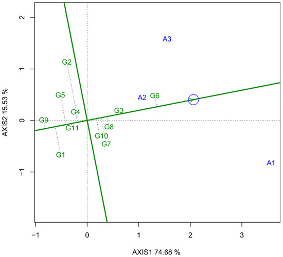 Finally, to ensure greater robustness in the conclusions, the adaptability and stability of the genotypes were also estimated using the GGE biplot method through a multivariate approach. To analyze all the variables simultaneously, the scores of the first principal component obtained from the principal component analysis were used as variables in the GGE analysis.