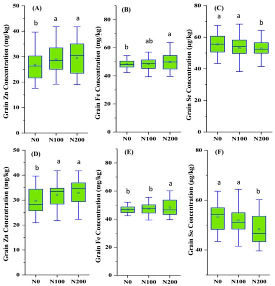 ANOVA results revealed significant effects of season, genotype, and N supply on Na, Mg, P, K, Ca, Zn, Fe, and Se concentrations in both grain and straw. Grain had significantly lower Na, K, Ca, and Fe concentrations and higher P and Zn concentrations than straw. On average, grain had a 305.0% higher Zn concentration and 74.5% lower Fe concentration than straw. Grain Zn concentrations showed an increased trend with the N supply increasing (Figure 1A,D); the average values under N0, N100, and N200 treatments were 26.8 mg/kg, 28.9 mg/kg, and 29.5 mg/kg, respectively. Similarly, the N supply significantly increased the grain Fe concentration, with the highest average achieved under N200 treatment (Figure 1B,D). Inversely, the grain Se concentration showed a decreased trend with the N supply increasing (Figure 1C,F); the average values under N0, N100, and N200 treatments were 55.4 μg/kg, 54.7 μg/kg, and 53.1 μg/kg, respectively.