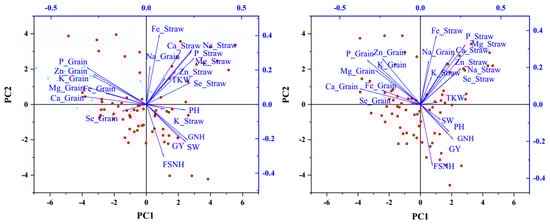PCA plots for the (left) 2020–2021 and (right) 2021–2022 wheat growing seasons. Abbreviations: PH, plant height; GY, grain yield; SW, straw weight; GNH, grain number per head; FSNH, fertile spikelet number per head; TKW, 1000-kernel weight; P_grain, grain P concentration; Mg_grain, grain Mg concentration; K_grain, grain K concentration; Na_grain, grain Na concentration; Ca_grain, grain Ca concentration; Zn_grain, grain Zn concentration; Fe_grain, grain Fe concentration; P_straw, straw P concentration; Mg_straw, straw Mg concentration; K_straw, straw K concentration; Na_straw, straw Na concentration; Ca_straw, straw Ca concentration; Zn_straw, straw Zn concentration; Fe_straw, straw Fe concentration; Se_straw, straw Se concentration.