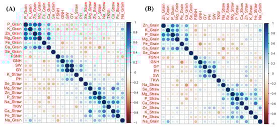 Correlations between agronomic trait and nutrient concentration in the 2020–2021 (A) and 2021–2022 (B) wheat growing seasons.