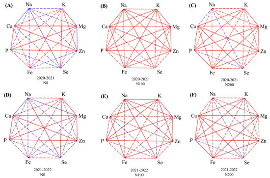 Correlations among grain elemental accumulation under (A,D) N0, (B,E) N100, and (C,F) N200 treatments during (A–C) 2020–2021 and (D–F) 2021–2022 seasons. Note: Blue and red lines indicate negative and positive correlations, respectively. Bold and dash lines indicate correlations are significant and non-significant, respectively.