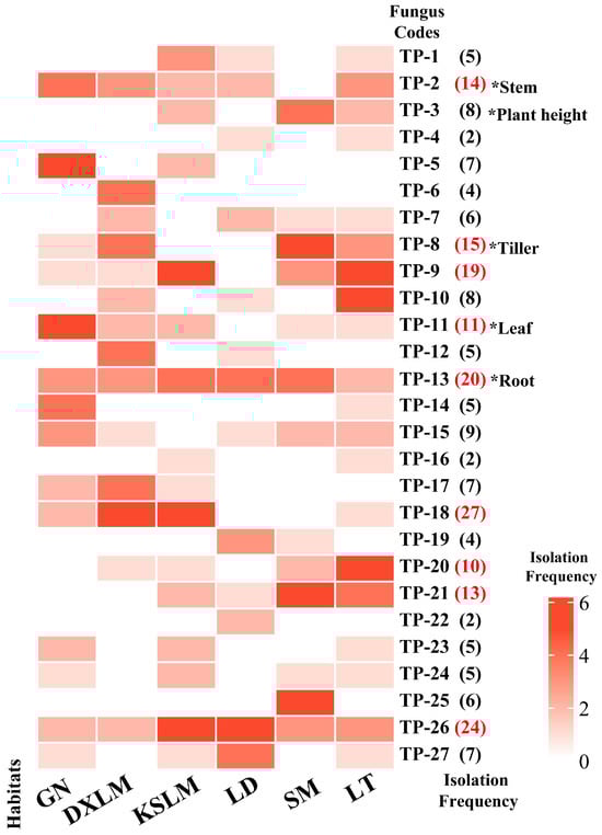 Isolation frequencies of 27 SAMF in six original habitats of D. officinale: GN (Guangnan County, Yunnan), DXLM (Langshan Mountain, Hunan), KSLM (Langshan Mountain, Hunan), LD (Luding County, Sichuan), SM (Shimian County, Sichuan), and LT (Luotian Town, Chongqing). Numbers in parentheses indicate the total isolation frequencies of each fungus across the six habitats. Red numerals denote strains with isolation frequencies > 10, reflecting their high prevalence in seedling stage. “*” indicates significant growth promotion, e.g., * leaf indicates significant enhancement of seedling leaf growth; p < 0.05.