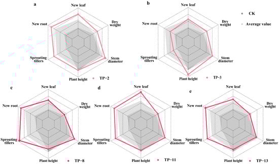 Performance of D. officinale seedlings after 90 days of symbiotic cultivation with mycorrhizal fungi TP-2, TP-3, TP-8, TP-11, and TP-13 in terms of various growth parameters. (a) TP-2, (b) TP-3, (c) TP-8, (d) TP-11, (e) TP-13. Gray-shaded area represents the performance of non-inoculated control group (CK) seedlings. Light-gray-shaded area represents the mean values of growth for seedlings inoculated with all fungal treatments.
