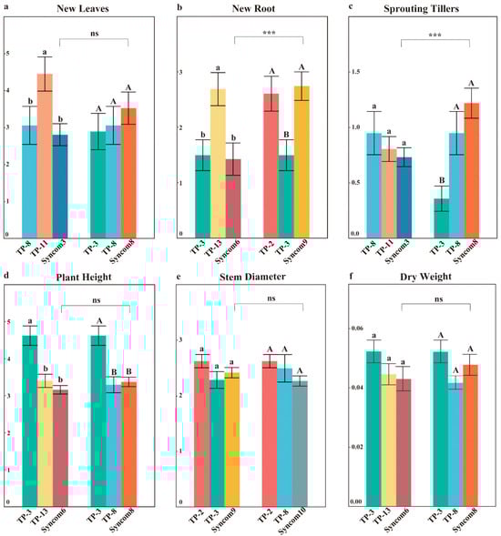 The impact of different synthetic fungal combinations on the growth of D. officinale seedlings. (a–f) Represent the effects of different synthetic fungal combinations on the new leaves, new roots, sprouting tillers, plant height, stem diameter, and dry weight in seedlings of D. officinale, respectively. Different uppercase/lowercase letters indicate significant differences among different treatments, p < 0.05, “ns” indicates no significant differences among different treatments. “***” indicates significant differences among different synthetic fungal combinations, p < 0.001.