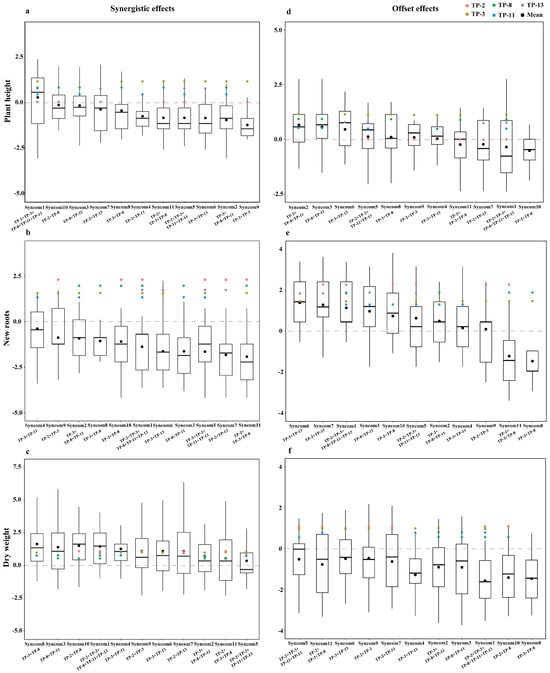Synergistic and offset effects of synthetic fungal combinations on the plant height, new root, and dry weight in seedlings of D. officinale. (a–c) Synergistic effects, (d–f) Offset effects. Box plots depict the deviation index between the effects of combination inoculations and the maximum or minimum effects of single fungi inoculations. Colored circles represent the mean effects of single fungi inoculations for each core OMF. Black circles represent the mean effects of combination inoculations.